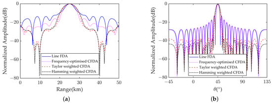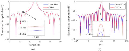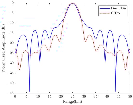 In optimizing the beampattern of a linear FDA, employing density weighting of the element spacing can lower the sidelobe level without compromising transmission power. However, the arc-shaped structure of the CFDA leads to an inverse density weighting of its element spacing. To counteract the impact of this inverse density weighting, we optimized the frequency offset of the CFDA by introducing a frequency distribution coefficient . We applied the frequency offsets detailed in Equations (8) and (19) to separately simulate the beampattern of the CFDA, and the outcomes are shown in Figure 10. These results demonstrate that the optimized frequency offset exerts a robust suppression effect on the sidelobes within the range domain.