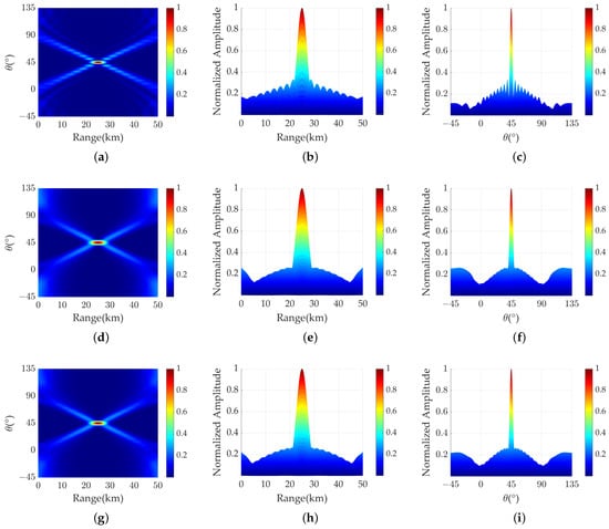 Beampatterns synthesis results. (a) CFDA beampattern. (b) In the range domain. (c) In the angle domain. (d) Hamming weighted. (e) Hamming weighted in the range domain. (f) Hamming weighted in the angle domain. (g) Taylor weighted. (h) Taylor weighted in the range domain. (i) Taylor weighted in the angle domain.