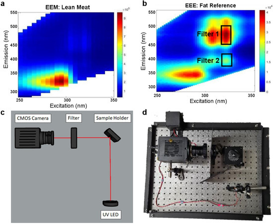 Excitation–emission matrices (EEMs). (a) Lean meat; (b) fat reference; (c) schematic diagram for optical apparatus; and (d) prototype instrument.
