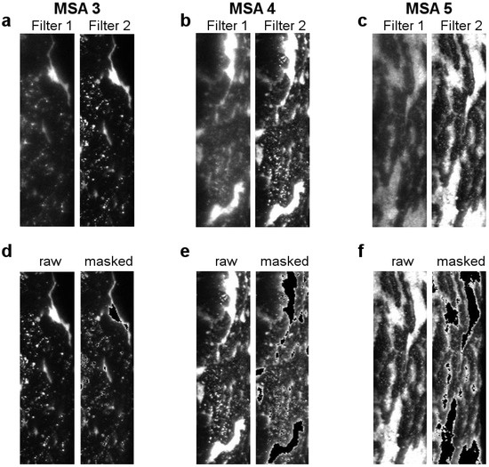 (a–c) Each panel consists of fluorescence images from Filter 1 and Filter 2 for (a) MSA 3, (b) MSA 4, and (c) MSA 5. (d–f) Each panel consists of fluorescence images from Filter 2 before and after using the masking for (d) MSA 3, (e) MSA 4, and (f) MSA 5.