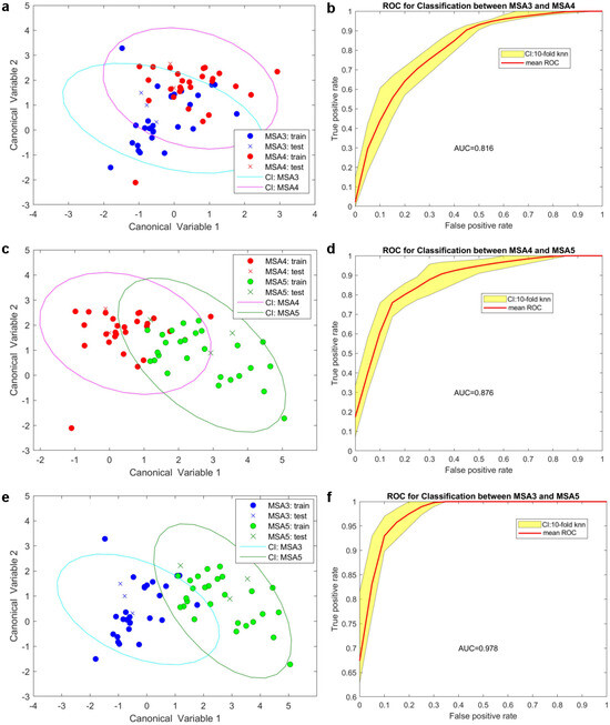 For cross-validation purposes, we divided each dataset into training (90%) and test (10%) subsets [26]. This approach was applied to each binary classifier, resulting in 10 observations per classifier. We then calculated the mean ROC curve and its distribution across all combinations. Figure 3 illustrates the training and test data points for each binary classifier (shown in Figure 3a,c,e), along with the corresponding mean ROC curve and its distribution by region (shown in Figure 3b,d,f). Among the comparisons, the distinction between MSA grades 3 and 5 demonstrated the highest separation effectiveness (AUC = 0.978), compared to MSA3 vs. MSA4 (AUC = 0.816) and MSA4 vs. MSA5 (AUC = 0.876).