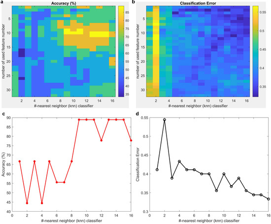 Overview of tuning parameters based on feature numbers and the kth value used in a knn-based classifier. (a) Accuracy and (b) classification error for the validated dataset. (c) accuracy and (d) class error calculation for a knn-based classifier for using 10 best features over different kth parameters.