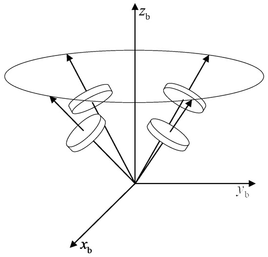 In reaction wheel systems, common configurations include the three orthogonal configurations, one oblique configuration, and the four skewed configurations, as illustrated in Figure 2 and Figure 3. The three orthogonal and one oblique configuration comprise four reaction wheels, with three wheels orthogonally mounted along the three axes of the satellite’s body coordinate system and one wheel obliquely mounted. The oblique axis is generally inclined at an angle equal to the satellite’s body coordinate system axes. In addition, the four-skewed configuration has all four wheels inclined and serving as backups to each other.