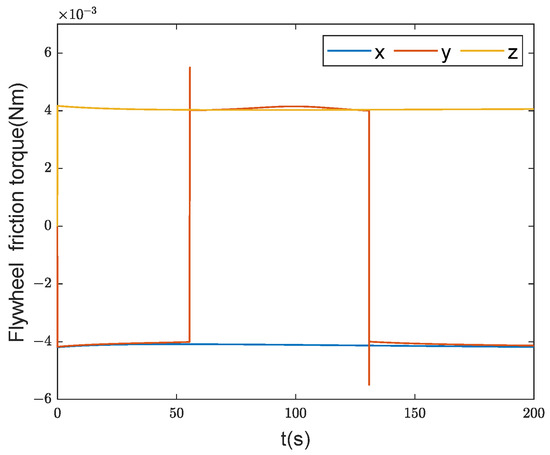 Utilizing the method presented in Section 3 provides the quaternion error and desired angular velocity between the current attitude and the desired attitude. The designed controller was then used to track the desired attitude. In this simulation, first the effectiveness of the disturbance observer was examined, with the corresponding results illustrated in Figure 5 and Figure 6. Figure 5 presents the actual friction torque values generated by the flywheel, and Figure 6 displays the observed flywheel friction torque values obtained by the disturbance observer. Figure 5 highlights that the flywheel experienced zero speed at 56 s and 132 s, resulting in a sudden change in frictional force. Comparing the two figures, it is evident that the designed disturbance observer successfully observed the frictional disturbance torque of the flywheel, albeit with a slight deviation at the zero-speed crossings.