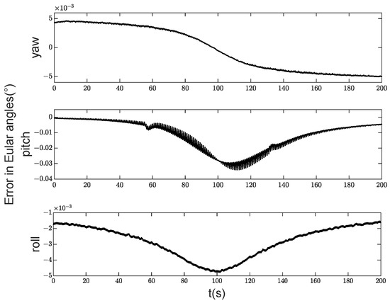 Figure 8 and Figure 9 infer that the satellite achieved high accuracy in yaw and roll angles, while the pitch angle accuracy was slightly lower. Specifically, by the controller with the feedforward compensation disturbance observer, the yaw accuracy was 0.005°, the roll accuracy was 0.005°, and the pitch accuracy was 0.03°. According to the controller without disturbance observer, the yaw accuracy was 0.007°, the roll accuracy was 0.007°, and the pitch accuracy was 0.07°. Comparing the results of the two types of controllers, it can be seen that the controller designed in this article has approximately doubled in accuracy.