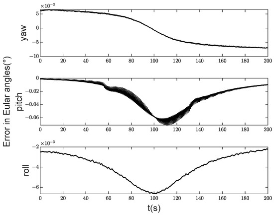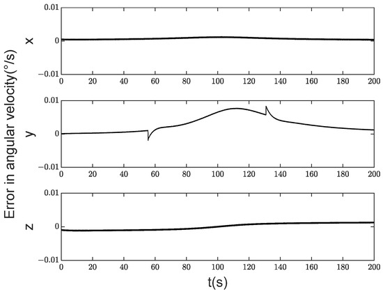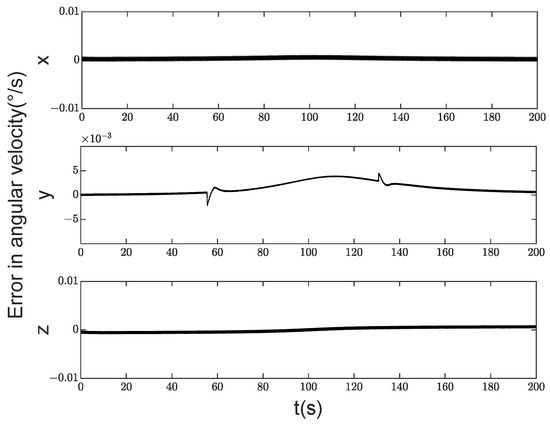 Figure 10 demonstrates that the satellite’s angular velocity control accuracy was high, with errors in all three axes maintained within 0.005°/s. From Figure 11, it can be seen that the controller without disturbance observer significantly increased the error in the pitch axis direction, which was 0.01°/s. The lowest accuracy in satellite attitude was observed around 110 s, primarily because the satellite is closest to the target point at this time, resulting in rapid changes in satellite attitude. The deviation between attitudes at the previous and subsequent instants is significant within one control cycle, preventing complete convergence to zero. This gives rise to a certain level of attitude control error.