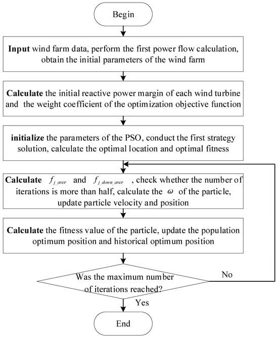 The reactive power optimization problem in WFs is typically highly nonlinear, often requiring the utilization of intelligent optimization algorithms for solutions. Among these, the PSO algorithm is favored for its fast search speed, wide search range, and fewer parameters, and it has thus been applied to solve reactive power optimization problems in WFs [,,,]. However, the PSO algorithm suffers from drawbacks such as easily falling into local optima and low convergence accuracy [,], leading researchers to propose various improved algorithms. Ref. [] proposed an Adaptive Discrete Binary Particle Swarm Optimization (ADBPSO) algorithm, which adjusts the inertia coefficient based on the fitness value of particles, thus accelerating the convergence speed. However, the algorithm suffers from the limitation of a small initial search range, making it prone to local optima. Ref. [] introduced a novel PSO algorithm that adjusts the acceleration factor of particles based on the number of iterations, effectively preventing particles from converging to local optima. Ref. [] addressed the slow search problem of PSO by introducing a constraint factor to control the inertia coefficient of particles’ velocity, thereby enhancing the search speed and convergence accuracy. However, the algorithm still encounters issues with falling into local optima. Ref. [] improved the PSO algorithm by incorporating the advantages of the Firefly Algorithm, resulting in faster convergence without enhancing convergence accuracy. Ref. [] linearly adjusted the inertia coefficient and acceleration factor of particles based on the number of iterations, improving the optimization speed and accuracy of the PSO algorithm. Nonetheless, the algorithm’s utilization of the random initialization method introduces significant randomness into the initial search range of particles, hence increasing the risk of falling into local optima.