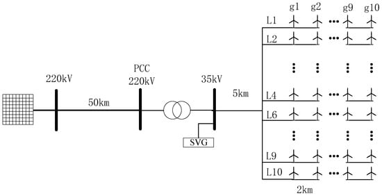 The OWF structure used in this paper is shown in Figure 2. The installed capacity of the WF is 300 MW, with each WT having a rated power of 3 MW. There are 10 WTs connected on each feeder line, with a distance of 2 km between adjacent WTs. There are a total of 10 feeder lines. SVGs are connected to the primary side of the step-up transformer at node 3. The grid connection point (node 1) is set as the slack bus for the WF power flow calculation.