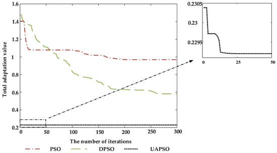 To validate the effectiveness of the proposed improved particle swarm algorithm in this paper, the traditional PSO algorithm and dynamic weighting particle swarm algorithm (DPSO) are selected to compare the optimization results. Under the operating condition where the active power output of the WT is 2.8 MW and the reactive power output limit is 1 MW, the voltage reference value is set to 0.97 p.u. The optimization objective function is formulated using Equation (4). The optimization results of each algorithm are shown in Figure 3 and Figure 4.