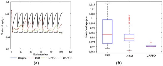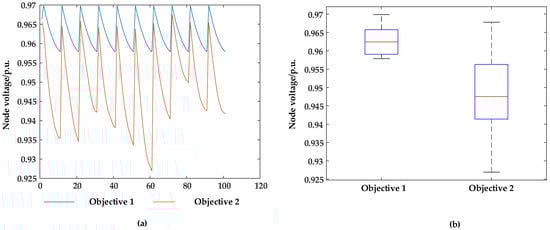 Comparison of optimization results for different optimization objectives: (a) node voltage curve and (b) nodal voltage box line diagram.