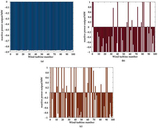 Optimized reactive power output of WTs calculated using different algorithms: (a) UAPSO algorithm; (b) DPSO algorithm; (c) PSO algorithm.