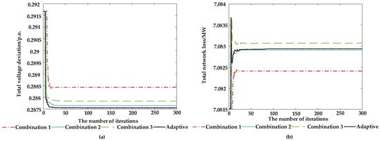 To verify the effectiveness of optimizing the objective function with adaptive weighting coefficients, different combinations of weights for the objective function are selected to compare the optimization results. Under the operating condition where the active power output of the WT is 2.8 MW and the reactive power output limit is 1 MW, the voltage reference value is set to 0.97 p.u. The UAPSO algorithm is used for strategy optimization. The optimization results for each weight combination are shown in Figure 7 and Table 4.