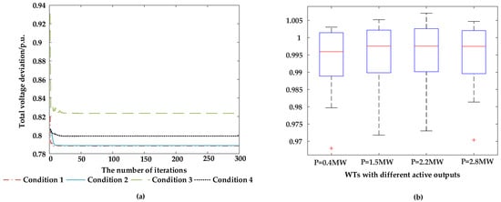 Optimization of voltage under different operating conditions: (a) iterative curves of total voltage deviation and (b) the WT terminal voltage box line diagram(where red + corresponds to outliers).