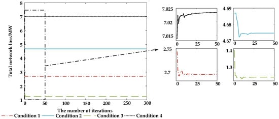 Figure 8 and Figure 9, respectively, compare the voltage and grid loss optimization effects under different operating conditions. In the figures, it can be observed that the optimized grid loss in the OWF is positively correlated with the active power output of the WTs. When the active power output is small, the optimized grid loss is also small; however, when the active power output is large, the optimized grid loss increases. At the same time, it can be seen that under different operating conditions, the total voltage deviation in the nodes in the WF is less than 1, indicating that the average deviation between the node voltages and the voltage reference value is less than 0.01 p.u. (a total of 103 nodes), and the optimized node voltages meet the requirements.