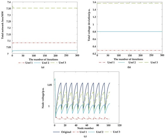Comparison of optimization effects with different voltage references: (a) network loss; (b) voltage deviation; and (c) node voltage.