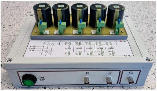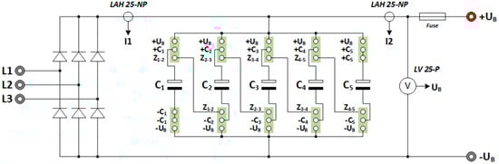 The voltage converter is designed to test the influence of changing capacitance of capacitors in a DC circuit on the shape of current and voltage waveforms. The converter design uses a three-phase rectifier bridge with a rated current of 35 A and a maximum operating voltage of 1000 V. The DC link circuit uses a bank of five capacitors with a capacitance of 470 µF each and an operating voltage of 400 V. Capacitors can be connected to the DC circuit by means of special jumper keys, which ensure flexible configuration of the connection topology. Thanks to applied design, it is possible to obtain series, parallel, or mixed connections of capacitors, resulting in a change in the overall capacitance of the system. Figure 1 represents the schematic diagram of the converter.