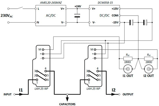 The converter is equipped with a current measurement system, I1 on the input side and I2 on the output side. The measurement system uses hall effect transducers of the LEM LH 25-NP type, which are configured to measure currents in the range −8 … +8 A. Figure 2 shows the connection diagram of the current measurement system and the power supply system.