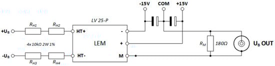 Additionally, the entire device has the ability to measure the voltage of the DC circuit (UB). Figure 3 represents a schematic diagram of the voltage measurement system. This system is equipped with an insulated hall effect voltage sensor of the LEM LV 25-P type with resistors that limit the input current. With this configuration, the system can measure voltages in the range of 10 …400 V.