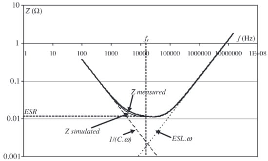Real capacitors can be represented by a series circuit consisting of capacitance, resistance, and inductance components (Figure 4). However, due to the inductance component of the capacitor being mostly pronounced for the high frequency signals (Figure 5) and low-frequency nature of the conducted experiment, the inductance (ESL—Equivalent Series Inductance) can be omitted in the model.