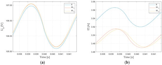 Comparison of simulation measurement data obtained under different load conditions. (a) UB voltage, (b) I2 current.