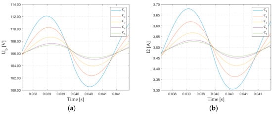 In Figure 9, it can be observed that the higher the capacitance, the smaller the DC link voltage and the ripple amplitudes of the load current.