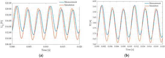 The model was validated by comparing two of its output signals, the UB voltage (Figure 10a) and the I2 current (Figure 10b) with measurements taken from the constructed system. The same capacitance and ESR as were used during the measurements were applied to the Matlab Simulink model.