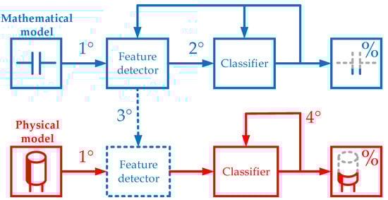 The implementation of the deep convolutional network TL technique for the proposed diagnostic task is carried out in two stages. In the first stage, the process of training the underlying structure (the blue part of Figure 11 below) is carried out on the basis of the data developed for information from the Simulink-designed model of the object. The input vector, containing 100 samples of the current and output voltage signals, was transformed into a matrix of 10 × 10 × 2 dimensions. It should be noted that the classical approach to convolutional networks describes the network as made up of contained layers that involve the extraction of features of the input matrix (convolutional layers) and the assignment of recognised features to one of the considered categories (classifier). Consequently, the first process to adapt the weighting factors of the underlying structure involves updating the parameters of the feature detector and the classifier. The verification of this step is carried out on the basis of the evaluation of the network response and the modelled capacitance percentage of the capacitor (capacitor failure stage).