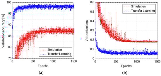 CNN training process for classic (simulation) and TL: (a) validation accuracy; (b) validation loss.