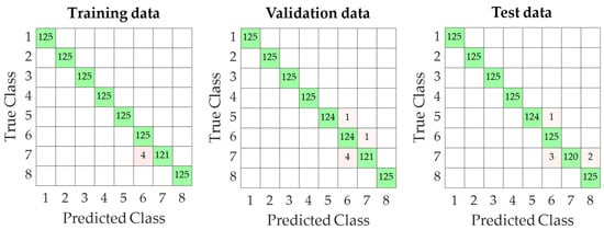 It is also worth looking at the nature of the errors observed in the confusion matrices in Figure 13. Three important phenomena were observed, the first is the effect of training on validation and test errors. The largest number of errors appears in these two sets, where the only error can be observed for the training set. This could have been an important point to pay attention to, but the error represents only 0.4% for the training and validation sets and 0.6% for the test samples, leaving the accuracy of fault classification higher than 99%. The second factor is the global localisation of the errors. Errors are localised at the lowest fault classes (classes 5, 6, 7, and 8). These are single errors, so they may be due to the similarity between the signals for such large-capacity changes with the small number of samples that the network uses for classification. This is confirmed by the third factor, which is the local location of the errors. The errors only cover neighbouring classes, with no glaring misclassification errors, which also confirms the presence of errors due to the small differences between the signals in each class.