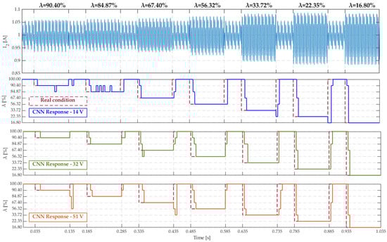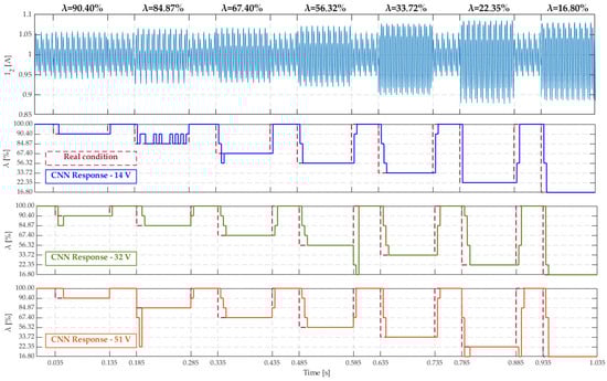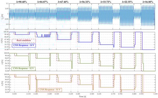 However, significant in terms of proper network operation, there may be fluctuations in the response for λ = 84.87% for the lowest value of the input voltage. Detailed analysis has found that they are caused by slight differences between the signals for λ = 84.87% and λ = 90.40% at the aforementioned input voltage value (which can also be confirmed by the single misclassification observed between 0.035 and 0.135 s for the RL1 load and λ = 90.40%). However, in each of the cases presented, the classification closes within the appropriate margin of error, without indicating that the capacitor is defective (assuming that a capacitor is considered defective when its capacitance drops below 80%); that is, without introducing the false negative. However, the high sensitivity of the proposed solution is worth pointing out here, which, despite small changes in capacitance at a low value of the supply voltage, can show a decrease in the capacitance of the capacitor under test. Another important finding is that the network does not maintain a detected change in the capacitance of the capacitor, but can demonstrate a healthy capacitor state again based on the provided measurements. This is important for the robustness of the solution to data transmission errors, where, if the results are sustained, the network, based on corrupted data, could incorrectly classify the capacitor state and sustain the misclassification, leading to incorrect conclusions and unnecessary failure prevention actions. As a result, incorrect classifications of individuals due to corrupted data will not affect the system’s performance.