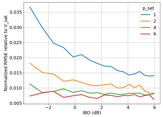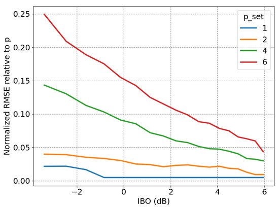 While the synchronization accuracy has been confirmed in the above subsection, the accuracy of the whole framework in estimating nonlinearity model coefficients should be assessed. For the same parameters mentioned above, 300 random time offsets, (samples), and random frequency offsets, (subcarrier spacings), were generated while varying Rapp model parameters p and . The Rapp model was iteratively obtained with initial vectors of tested p and values containing 50 equidistant samples in the ranges of , and , respectively. The root mean squared errors of the estimates, normalized by real values, are presented in Figure 4 and Figure 5 for p and , respectively. For easier interpretation, the value is converted into IBO on the x-axis. In both cases, higher NRMSE is expected for very low IBO values. A very low IBO results in a significant part of the transmitted waveform being clipped, resulting in stronger distortion on the output. In such conditions, synchronization at the receiver performs worse, reducing estimation performance. However, by decreasing the PA input power (e.g., by introducing some additional attenuation), the IBO increases, allowing the PA to be characterized more accurately. For the case of an IBO equal to 4 dB for all the tested p-values, the estimation error is less than for p and less than for . These estimates seem to be accurate enough to characterize the PA.