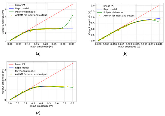 Figure 6 presents examples of AM/AM characteristics obtained for all three tested PAs, along with Rapp models and polynomial models. It can be observed that both models accurately approximate the received signal in the low-amplitude region. However, for the higher input signal amplitudes, the polynomial model reveals a significant error. While increasing the polynomial order may potentially reduce this error, it would also lead to a significantly higher number of coefficients compared to the Rapp model, which utilizes only three parameters. On the other hand, the characteristics obtained from the Rapp model almost perfectly match the AM/AM samples across the entire range of input amplitudes. It can be concluded that the Rapp approximation is much more accurate for these amplifiers.