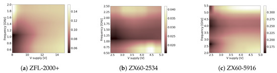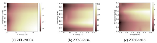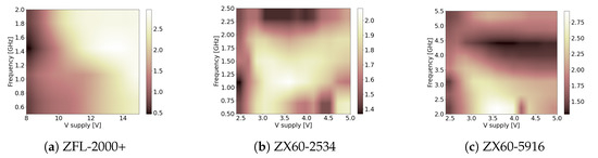 First, it can be observed that the gain for each PA increases with the supply voltage. Nevertheless, the rate of this increase is significantly different between frequencies. It is worth noting that in each scenario, there is a significant difference between the highest and the lowest values, equivalent to at least a two-fold difference. Recall that this represents a voltage gain in linear scale, equating to a power gain change of at least 6 dB. A similar analysis is observable when examining the variability of the PA smoothness factor, p, in Figure 8. For the ZFL-2000+ model, the nonlinear working range increases with the rise in both the supply voltage and frequency, expanding smoothly across input parameters. However, for the other two models, significant variability in the p-value is noticeable. Despite significant differences between the PAs, it is noteworthy that the maximum p-values for all cases do not exceed . This implies that the examined amplifiers generally exhibit highly nonlinear behavior. Finally, the saturation voltage, , changes with the input parameters by at least two-fold for each PA, as shown in Figure 9. While in general, it is the lowest for a low supply voltage, its variability represents a non-trivial function of two input parameters.