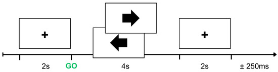 In the MI task, participants completed a total of 200 trials (100 for each thumb). The order of trials was randomly generated, with each trial lasting for 8 s (±250 ms), as depicted in Figure 2. During the initial two seconds, participants fixated on a cross presented on the screen. At the 2 s mark, the cross was replaced by an arrow indicating which thumb to move, lasting for 4 s. During this window, participants were required to imagine the movements within the first second after the presentation of the cue. The cross replaced the arrow during the last two seconds.