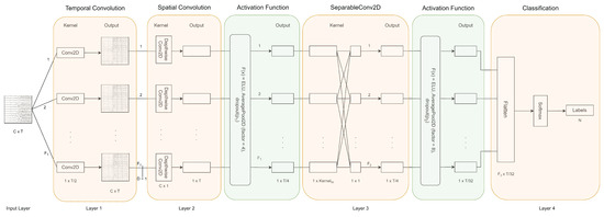For our MI classification task, we employed the EEGNet neural network [32]. Illustrated in Figure 3, EEGNet is a specialized 4-layer CNN designed specifically for EEG-based BCIs. This CNN is designed to process EEG input with C channels and T samples per channel. The C parameter is determined by the number of electrodes employed during data collection, while the parameter T is influenced by the time-window frame and the sampling frequency. To clarify, if the time window is seconds and the sampling frequency is Hz, the number of samples would be . Notably, this CNN stands out as it incorporates both temporal and spatial convolution layers.