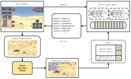 The overall framework diagram of the method proposed in this article is presented in Figure 2. Initially, the intelligent agent samples actions from the action space. The selected action is then transmitted to the simulation environment, where it is executed accordingly. Upon completion of the action, the current video frame is captured and fed into the target detection model for processing. This process extracts the coordinates and size information of the monitored object. Subsequently, the detection results are further processed to derive the current state information. The agent then stores this state in an experience replay pool for sampling, learning, and updating network parameters. A key aspect of this design is the decoupling achieved through the introduction of an object detection model. This allows for direct substitution of the object detection model to adapt to different application scenarios or monitoring targets, eliminating the need for retraining. Additionally, this architecture facilitates the migration of models to hardware devices.