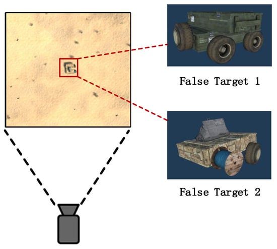 At the far end of the scene, a deceptive, false target is positioned. The experimental environment settings are depicted in Figure 7.