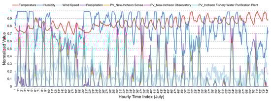 Figure 1 shows a synchronized overview of normalized meteorological variables and solar PV power generation at three different locations in Incheon for July 2019. Each variable—temperature, humidity, wind speed, precipitation, and PV power generation for three solar power plants in Incheon—is represented by a min–max normalization to ensure an equitable scale of 0 to 1. This normalization technique allows us to identify patterns and correlations in the fluctuating climate of Incheon’s monsoon season and its subsequent impact on PV power generation. The hourly time index represents a sequential timeline that captures the intricacies of solar energy variability in a region characterized by strong climatic transitions. This graphical representation not only illustrates the temporal distribution of each parameter but also serves as a powerful visual reinforcement of the variability inherent in solar energy systems, especially during periods of climatic extremes such as the onset of the East Asian Monsoon [45].