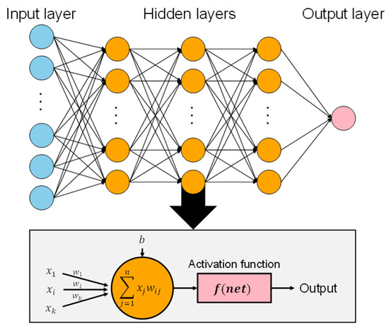 A multilayer perceptron (MLP), also known as a typical NN configuration, allows computers to learn tasks by example, as shown in Figure 3 [46]. It is similar to a schematic that guides the computer in formulating a solution to a problem. The framework of an MLP consists of individual elements, called perceptrons, organized in layers. An MLP conventionally includes three types of layers: the input layer, which captures data that the computer uses to make a prediction; one or more hidden layers, which relevant pertinent information from the input layer to refine the prediction; and the output layer, which provides the final result based on the synthesized information from the hidden layers [46,47]. We used Equation (6), which integrates the input data, neural connections (weights), and an activation function, to compute the output values of the neurons in the hidden layer of an MLP.