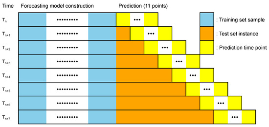 We used R Ranger to construct an online learning model that uses time series cross-validation (TSCV) to address these challenges [65]. TSCV emphasizes the evaluation of multiple prediction horizons within each training set. Additional training sets were used according to the planned time period, each containing one observation not included in the previous training set. We designed the test set to range from one hour to one day (up to 11 h) after the current period to allow for multistep-ahead prediction of solar PV power generation, as shown in Figure 5. The prediction accuracy was calculated at each time point and the results were averaged to evaluate the effectiveness of the prediction model. To train the Ranger model, nine input variables were selected, encapsulating predictions from DNNs with 2 to 10 hidden layers. In addition, in accordance with best practices and to tailor our model specifically for regression tasks, we set the number of trees to 128 and the number of features to 3, reflecting one-third of our nine input variables for optimized regression [57,66].