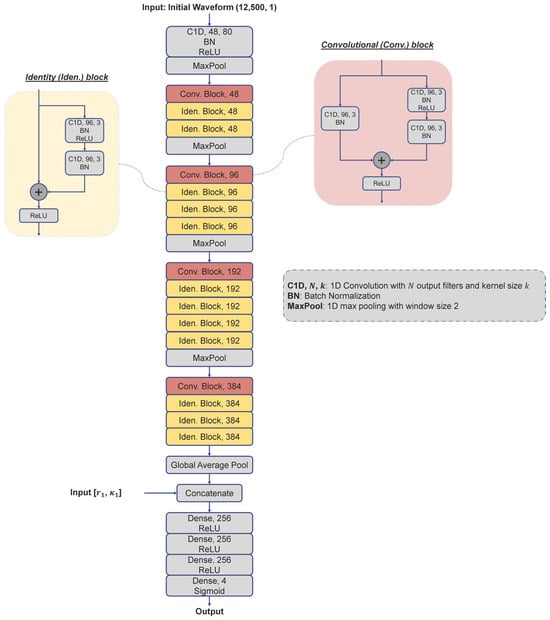 Figure 1 shows the proposed ILSW-Net architecture dedicated to resolving the regression problem. It consists of two main parts, namely a convolutional feature extractor followed by a cascade of dense layers. The convolutional feature extractor is inspired by the residual network architecture [] and influenced by the 1D ResNet model []. It receives the initial waveform of size 12,500 as input and learns discriminant features through the cascade of 1D convolutions and max poolings. Specifically, it makes use of two residual building blocks, namely a convolutional (Conv.) block and an identity (Iden.) block. the Conv. block has two branches, in which the first branch contains a Conv1D and the second branch has 2 consecutive Conv1D layers, allowing feature learning at different receptive fields of 3 and 5. These features are then combined by an addition. In the case of the Iden. block, the first branch is simply the input of the block. At the end of the convolutional feature extractor, global average pooling is used to obtain a vector with a length of 384.