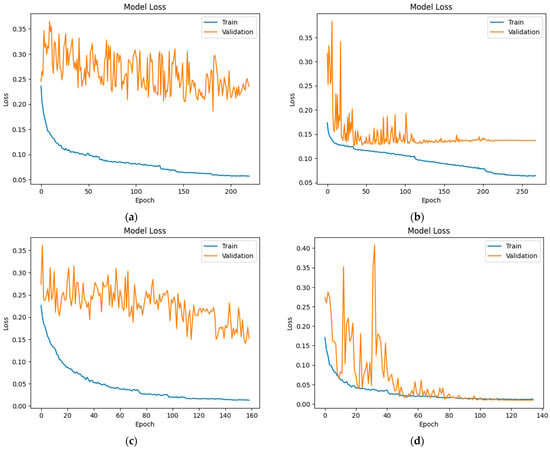 Figure 2 shows the evolution of the training/validation loss during the learning procedure. We can see that in the first two configurations, when using only the waveform input (Figure 2a,b), the model cannot converge, with a high training loss at the end. When using the complex refractive index () as input (Figure 2c), the model can remarkably converge, with training loss reduced significantly. This demonstrates the impact of using in facilitating the learning of ILSW-Net. However, the validation loss is still very high compared to the training loss; this means that the model exhibits overfitting. Fortunately, by normalizing the data (Figure 2d), the two-input ILSW-Net is successfully optimized, with better convergence, no overfitting, and a more stable validation loss curve.