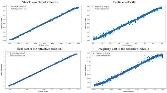 Scatter plot of four values, namely , , and the real part () and the imaginary part () of the refractive index (). The original values are depicted on x-axis, while predicted values are displayed on the y-axis.