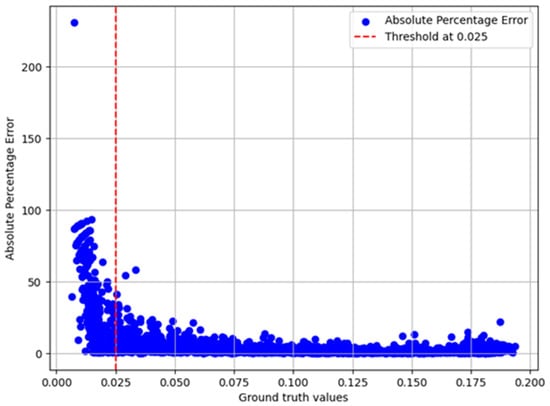 Distribution of ground-truth values of and the corresponding absolute percentage error (on the y-axis).