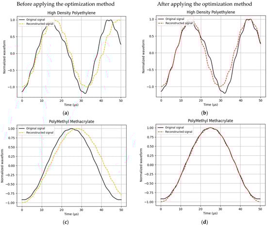 First, the initial predictions (, , ) are generated by ILSW-Net using the normalized physical signal and the real/imaginary parts of as two inputs. Then, they are refined by the Nelder–Mead algorithm, further enhancing their accuracy. In Figure 5, the graph serves as a visual guide for comparing the differences between the experimental waveform and the waveform calculated using known values of , along with the predicted values of , , and . It is shown clearly that the signal reconstructed using the final predictions from ILSW-Net and the optimization algorithm fit better with the original signal. The estimations of , , and complex are given in Table 4. The accuracy of ILSW-net is compared for values obtained from the experiments. These values are calculated from the experimental impact velocities with hydrocode shock behavior numerical simulations. The impedance-matching method is applied with a Mie–Gruneisen equation of state for the materials []. Notably, the accuracy of and is increased after applying the optimization algorithm. These improvements may suggest a positive influence on the predicted values of the complex refractive index. The accuracy is better for the shock velocity than for the particle’s velocity, which seems to be correlated with the original signal itself, with a higher number of periods for the high-frequency part of the double oscillations of the original signal and only one period for HDPE and half a period for PMMA samples.
