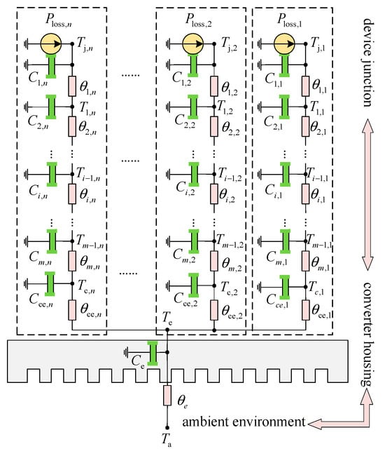 The thermal safety assessment of devices relies on effective thermal analysis methods. At present, the commonly used device thermal analysis methods mainly include the finite element method and the equivalent thermal network model method []. The finite element method simulates the 2D or 3D temperature field distribution of a power device and its converter housing through the grid division of the calculation area [,]. Due to the huge amount of calculation required, the finite element method is more suitable for designers of semiconductor devices who require detailed information about the time–spatial temperature distribution of a device structure. The equivalent thermal network model estimates variations in device temperature and converter housing temperature based on the thermal–electrical analogy []. The equivalent thermal network model is expressed as an RC electrical network based on the thermo-electric analogy in which the voltage, current, and RC parameter correspond to temperature, thermal power, and thermal impedance, respectively. Since the thermal network model only provides the temperature information of a limited number of nodes (mainly junction, case and heatsink temperature) between the device and the environment, it has the advantages of small calculation requirements and convenient use. For this reason, the thermal network model is usually used for the online thermal analysis of power devices.