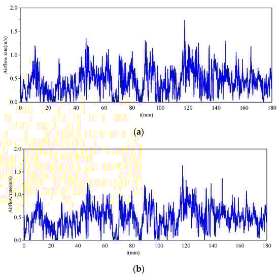 Comparison of airflow rate in the natural environment and the experimental environment. (a) Airflow rate in the outdoor environment; (b) airflow rate in experimental environment; (c) full-scale deviation in airflow rate between the two environments.