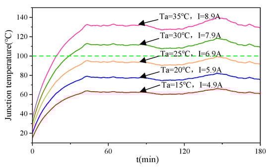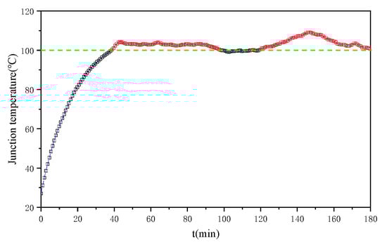 Figure 6 shows the junction temperature variation in the power device Q1 when the converter operates at a 7.5 A load current and the above random airflow rate. To conveniently observe the junction temperature fluctuation in the device under natural convection conditions, the junction temperature presented here is the peak value in each converter commutation. That is, the fluctuation in junction temperature caused by commutation is not presented in the results.
