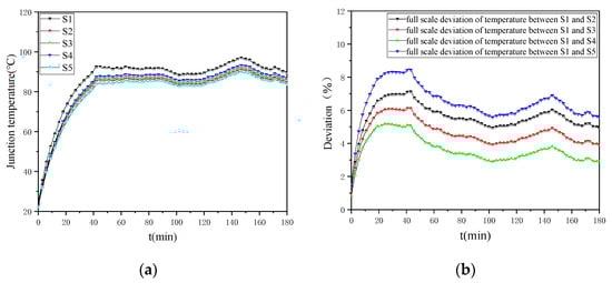 In addition, the center temperature of the five metal surfaces is also measured to verify the good thermal conductivity of the converter housing, as shown in Figure 7a. Figure 7b shows the full-scale deviation between the temperature on the surface S1 and the temperature on the other surfaces. It is easy to find that the temperature on the back surface (S1) of the housing with the power device is the highest, while the temperature of the front surface (S5) is the lowest. The maximum full-scale deviation in temperature between surface S1 and surface S5 does not exceed 8.5%F.S, indicating that the temperature difference between these surfaces is small. Therefore, the thermal conductivity of the converter housing is good and its surface temperature distribution can be ignored in this study.