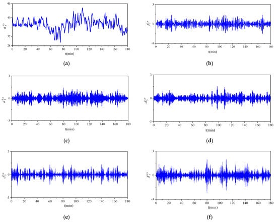 Wavelet packet transform is a typical time–frequency domain analysis method that reflects the variation characteristics of signals in different frequency bands by using different groups of wavelet packet coefficients []. The wavelet packet coefficients are obtained by wavelet decomposition, which is given by